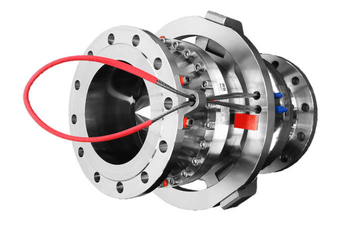 在實(shí)際應(yīng)用過程中,鋼絲繩需要被固定到任意一個(gè)固定不被移動(dòng)的點(diǎn)上,當(dāng)拉斷閥隨著軟管或設(shè)備被拖動(dòng)到限制距離時(shí),鋼絲繩則會(huì)繃緊,此時(shí)鋼絲繩傳遞一個(gè)很小的致斷力,就會(huì)拉松兩半拉斷閥之間卡爪的寶石環(huán),卡爪被釋放,從而兩半拉斷閥分離。同時(shí),拉繩式拉斷閥在閥體內(nèi)部?jī)啥送瑯优溆型ㄟ^彈簧驅(qū)動(dòng)的截止閥,能夠快速推動(dòng)蝶閥復(fù)位,在斷開瞬間快速截止兩側(cè),防止流體泄露。